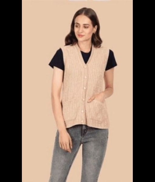 Beige sleeveless button down woolen cardigan with pockets