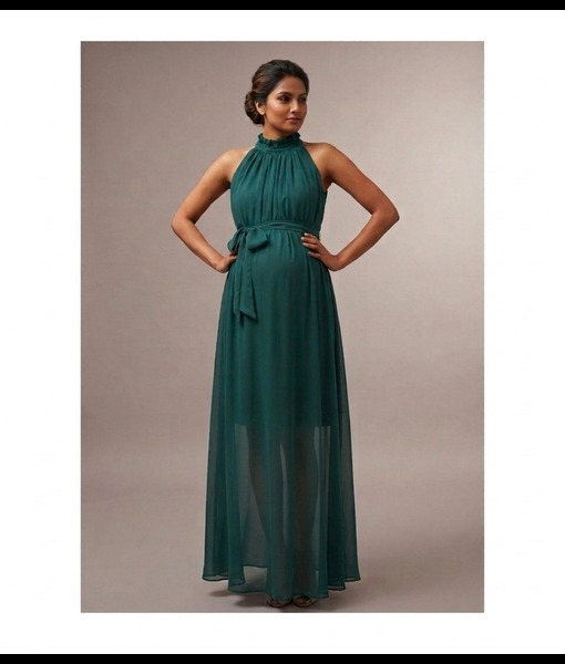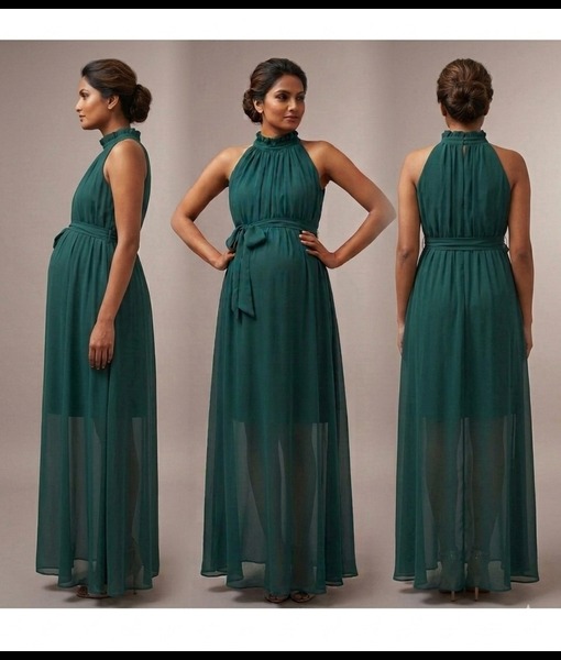 Bottle Green maternity party wear dress, maternity photo shoot dress, bottle green floor length georgette sleeveless dress.