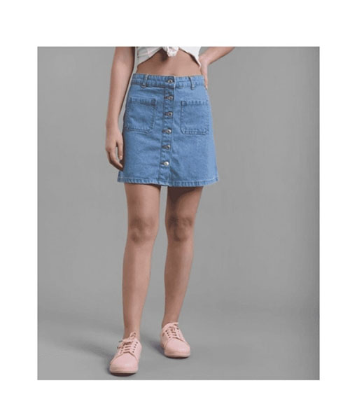Light blue denim skirt with buttons.