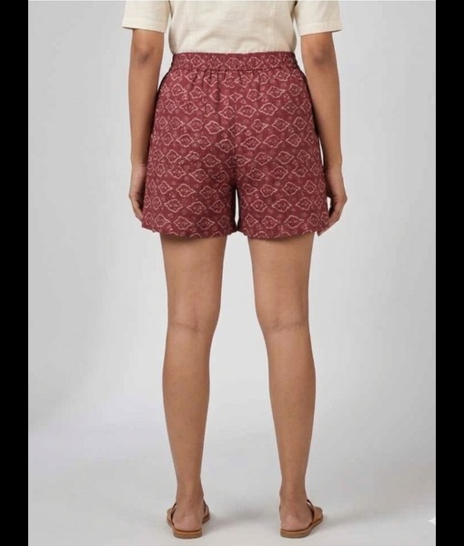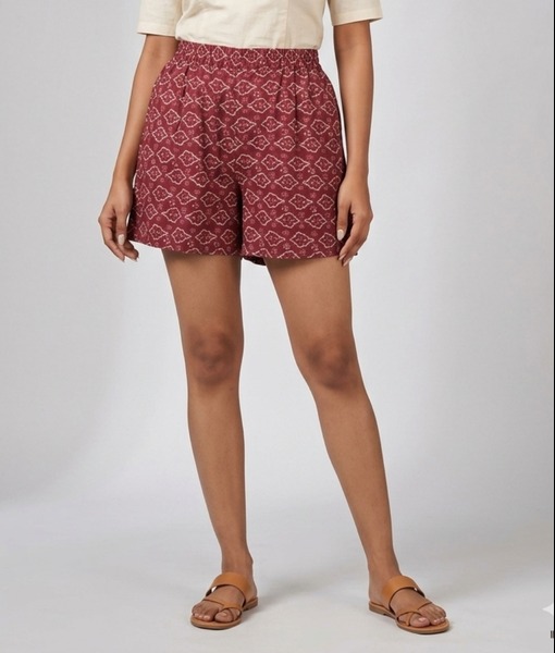 *The colour of the item may slightly vary from picture due to light effect during photo shoot.Maroon printed soft cotton women shorts.