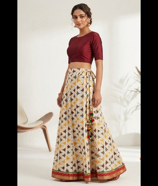 Yellow multi-colour cotton long skirt with lace border for women and girls.