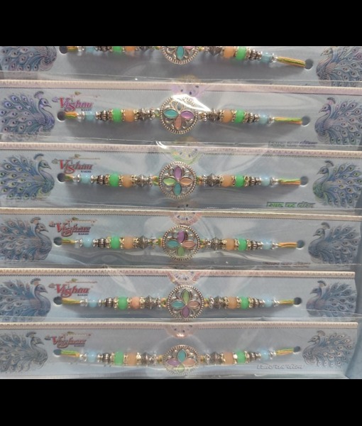 *The colour of the item may slightly vary from picture due to light effect during photo shoot.Pastel beads silver colour rakhi with chawal chandan tika pack.
