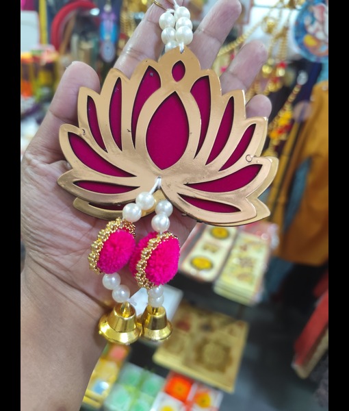 *The colour of the item may slightly vary from picture due to light effect during photo shoot.Pink Lotus cut out with pom pom and bell hanging for Diwali home decoration.