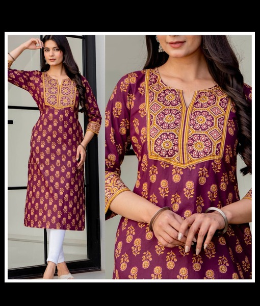 Purple soft cotton sequence work yoke long kurti. Beautiful Kalamkari print with hand work on yoke and sleeves.