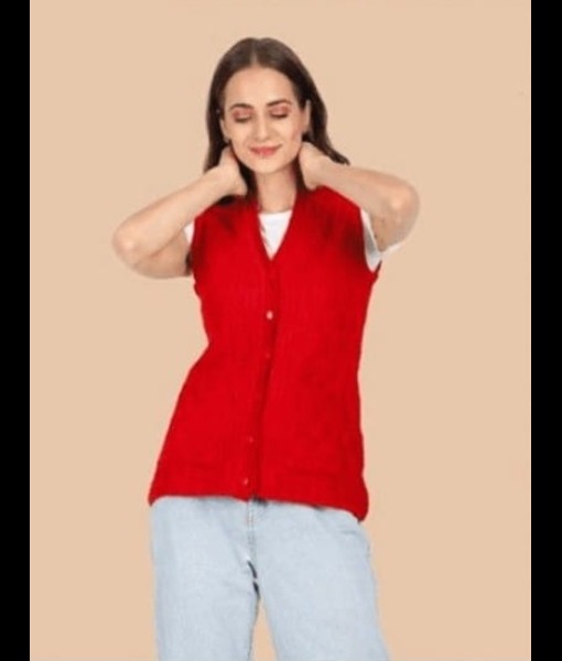 *The colour of the item may slightly vary from picture due to light effect during photo shoot.Red sleeveless button down woolen cardigan with pockets.
