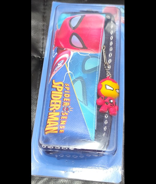 *The colour of the item may slightly vary from picture due to light effect during photo shoot.Spider Man 2 Pockets pencil pouch with a hanging charm.