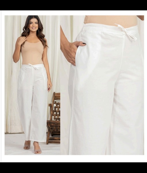 White cotton solid poplin palazzo (Export quality). Half elastic on back side, half belt in front with drawstrings for better fit.